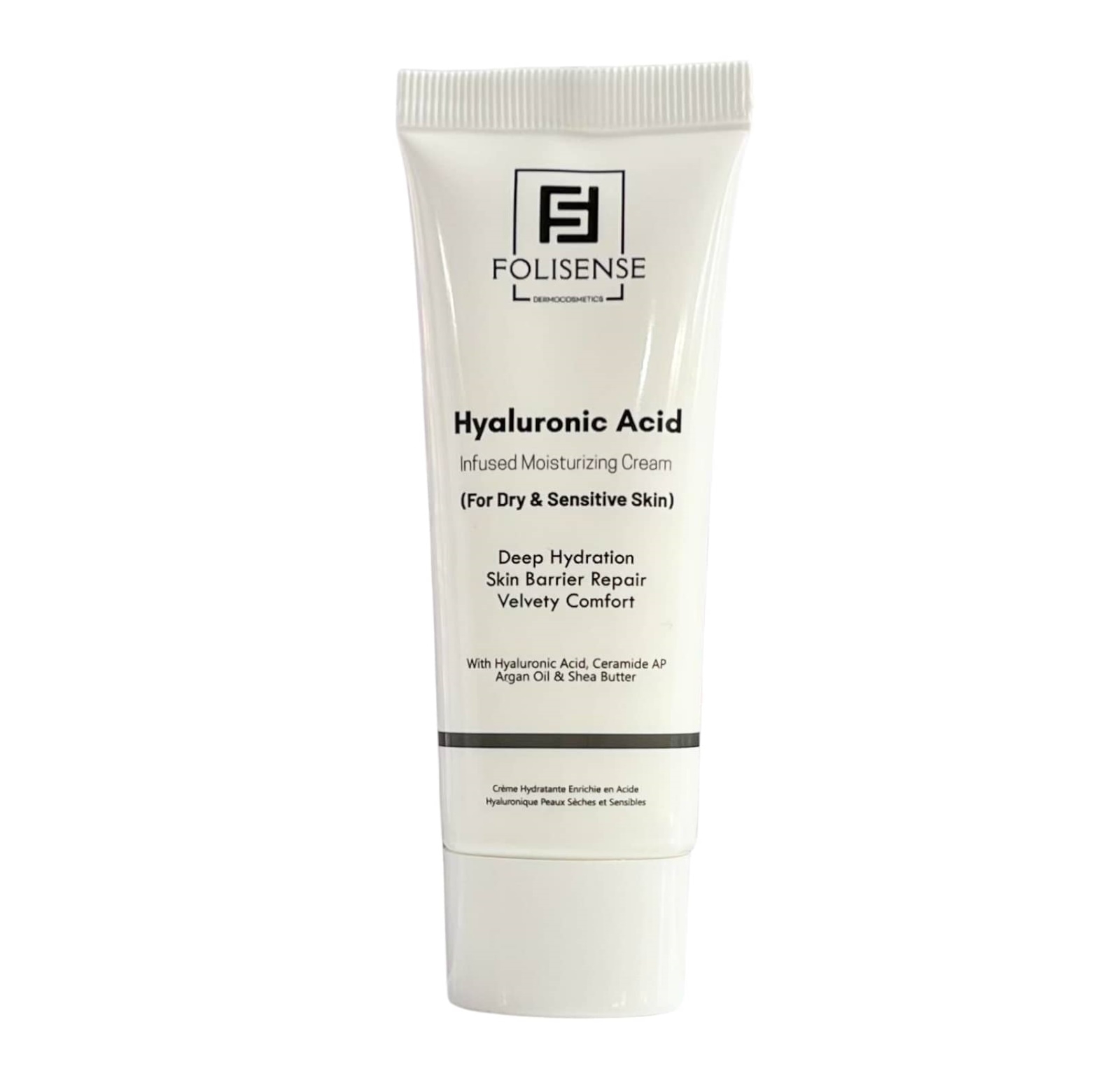 کرم مرطوب کننده هیالورونیک اسید فولی سنس یک فرمولی غنی و تخصصی برای پوست های خشک و حساس غنی شده با هیالورونیک اسید، سرامید AP و روغن آرگان است که رطوبت رسانی عمیق و ترمیم سد محافظتی پوست را به طور همزمان انجام می دهد.