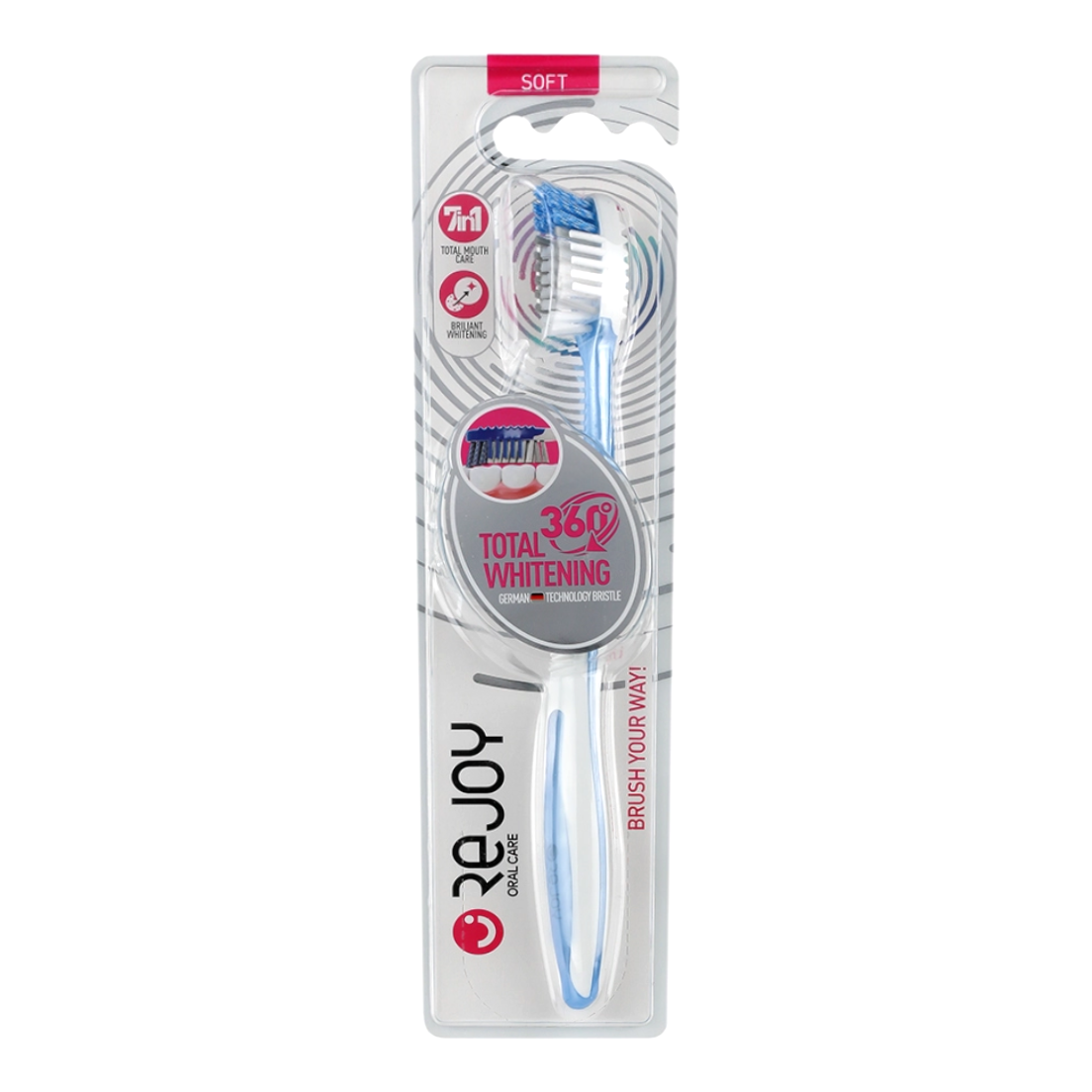 مسواک توتال وایتنینگ 360 درجه  ری‌جوی با الیاف مورب تا 99٪ پلاک‌های دندانی را از بین می‌برد و 5 برابر قدرت بیشتری در از بین بردن جرم‌ها دارد. این مسواک با زبان‌شوی و شوینده‌ی گونه باکتری‌های فضای داخلی دهان را از بین برده و باعث خوشبو شدن تنفس شما می‌شود.