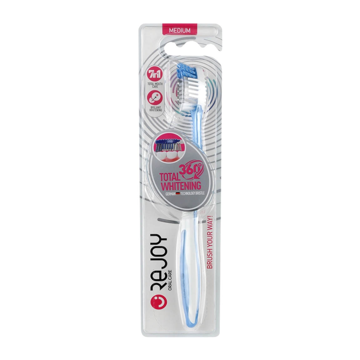 مسواک توتال وایتنینگ 360 درجه ریجوی با الیاف مورب تا 99٪ پلاکهای دندانی را از بین میبرد و 5 برابر قدرت بیشتری در از بین بردن جرمها دارد. این مسواک با زبانشوی و شویندهی گونه باکتریهای فضای داخلی دهان را از بین برده و باعث خوشبو شدن تنفس شما میشود.