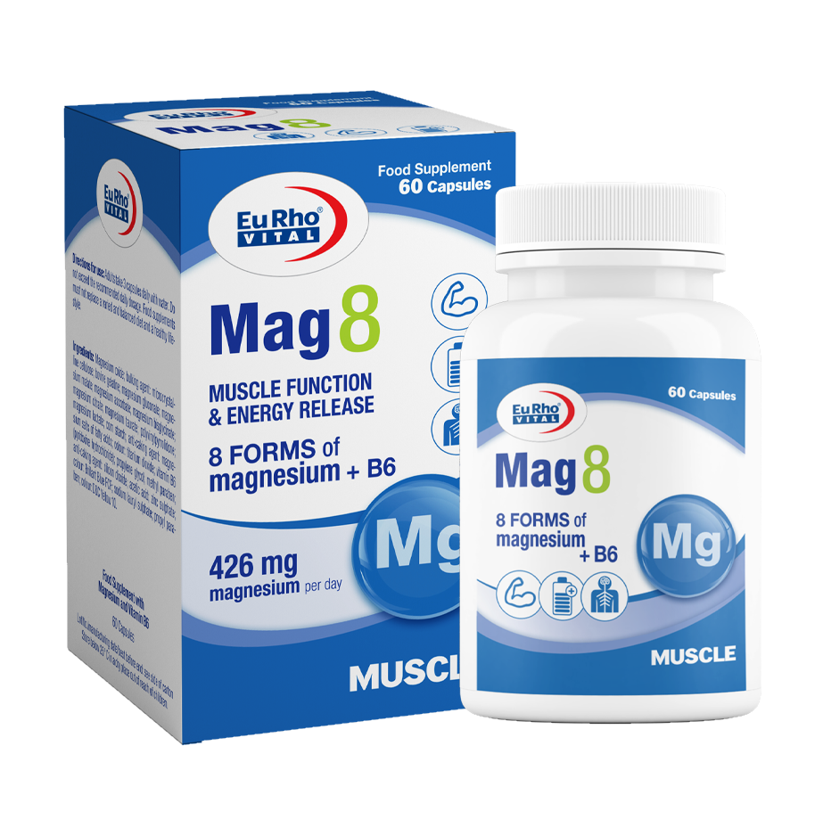 کپسول مگ 8 یوروویتال حاوی 8 ملح مختلف منیزیم (بیسگلایسینات، سیترات، مالات، لاکتات، تائورات، اکساید، گلوکونات و آسکوربات) به همراه ویتامین B6 است که به تقویت عملکرد سیستم عصبی، رفع گرفتگی های عضلانی، افزایش توان جسمی و بهبود خلقوخو کمک می کند. وجود 8 ملح متنوع منیزیم در این مکمل باعث جذب بهتر و اثربخشی بالاتر منیزیم در ابعاد مختلف سلامتی می شود.